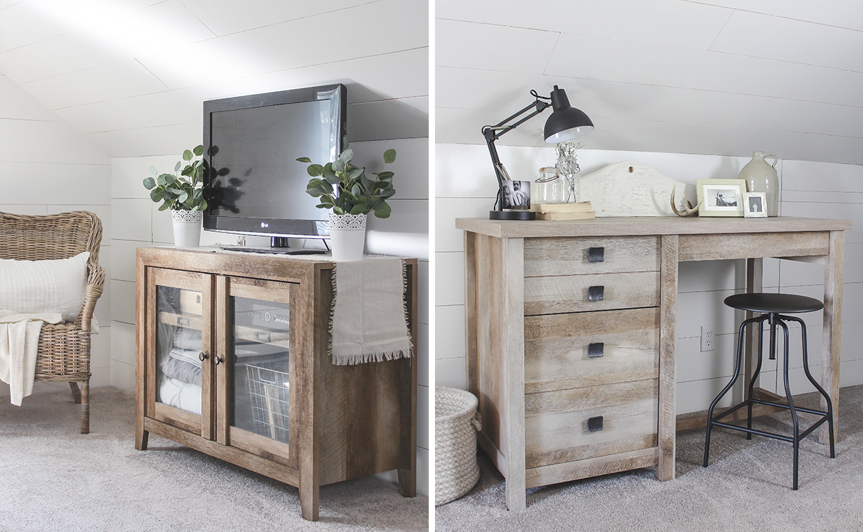 Then, we framed the bed area by installing a faux wood beam above the bed with delicate lace curtains off to either side. To complete the look, we added several pieces of Sauder furniture to add storage and functionality to the room.