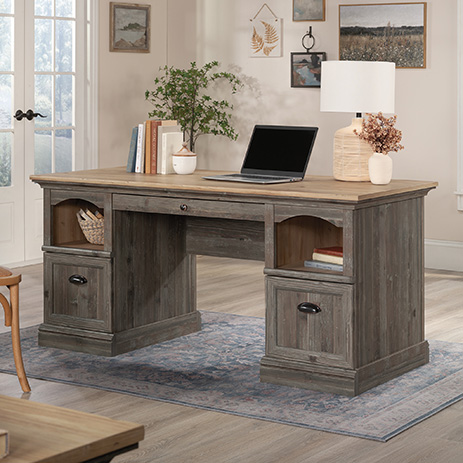 Center drawer has flip-down front for keyboard/mouse or laptop
