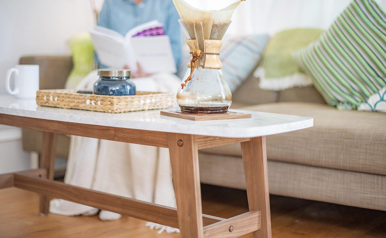 The faux-marble finish top of the Soft Modern Coffee Table resists heat, stains and scratches so it’s safe to set your cup of coffee or tea on. Photo courtesy: Colleen Ludovice