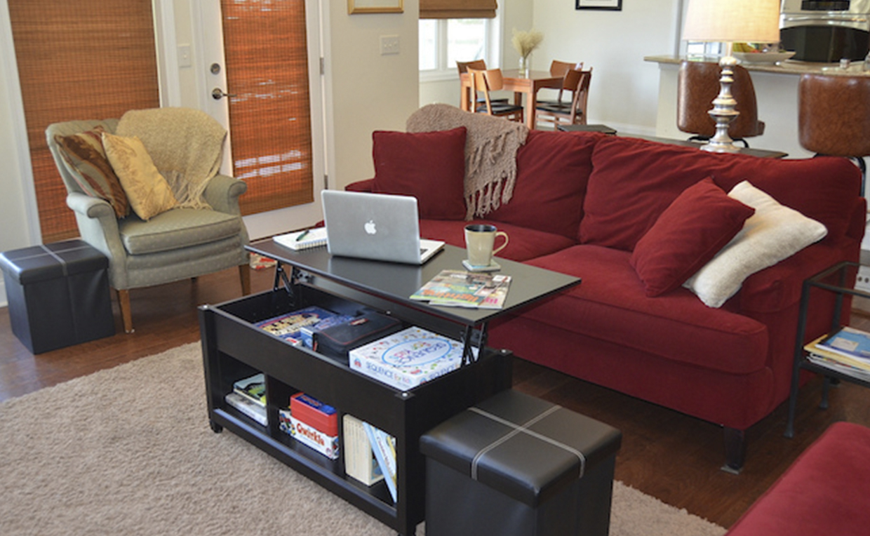 EXPERT PICK — COFFEE TABLE: Shannyn of Frugal Beautiful chose the Carson Forge Lift-top Coffee Table because she loves how it hides clutter and keeps food out of the dog’s reach!